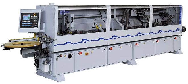 Быстросменная склеивающая часть для клея-расплава. Защищенная от вытекания емкость для клея под клеенаносящим роликом для предотвращения загрязнения станка. Точно дозируемое нанесение клея на заготовку с помощью клеенаносящего ролика, при этом не требуется настройка на толщину детали. Направление вращения клеенаносящего ролика по выбору в направлении или против направления подачи. Контроль температуры клея с помощью электронного термостата. Автоматическое снижение температуры клея в клеевом бачке при перерывах в работе. Активирование клея-расплава с помощью инфракрасного излучения. Автоматический магазин для рулонного и полосового кромочного материала, вкл. тарелку для рулона диаметром 800 мм. Оснащение усиленными ножницами для предварительной торцовки кромочного материала из ПВХ/АБС сечением макс. 3х45 мм. Стандартное оснащение системой оптического контроля расстояния между подаваемыми заготовками и кромочным материалом. Тяжелая зона прижима с главным прижимным роликом с пневматическим приводом, а также с 3 не приводными допрессовывающими роликами. Стандартное оснащение системой ручной центральной смазки транспортной цепи. Центрально регулируемый механизм верхнего прижима. Пульт управления на входе станка.